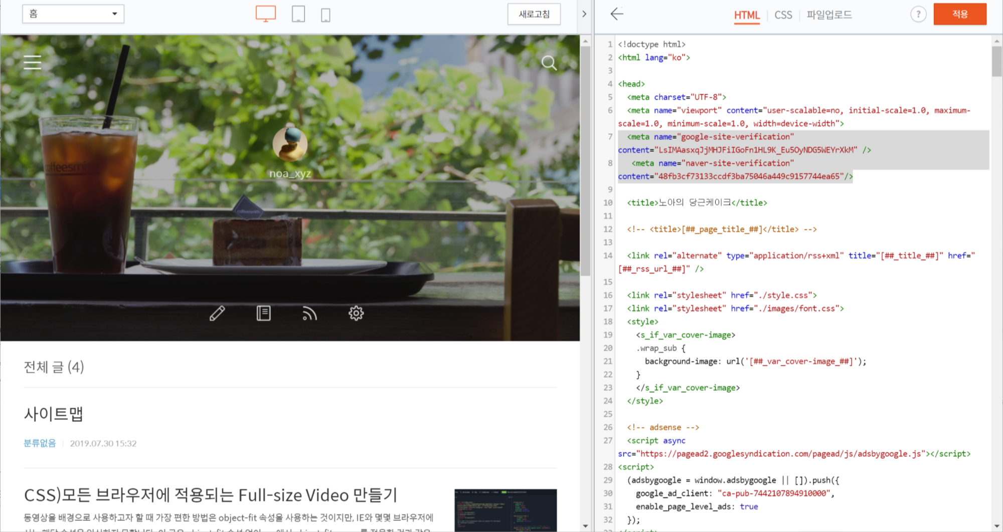 붙여 넣은 후에 적용 을 클릭하고 네이버 웹마스터 도구로 돌아와서 사이트 소유 인증을 진행합니다.
