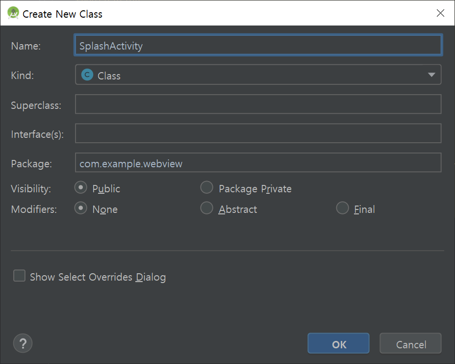 MainAcvitity와 같은 위치인 app > java > (패키지 이름)에 SplashActivity.java를 생성합니다.