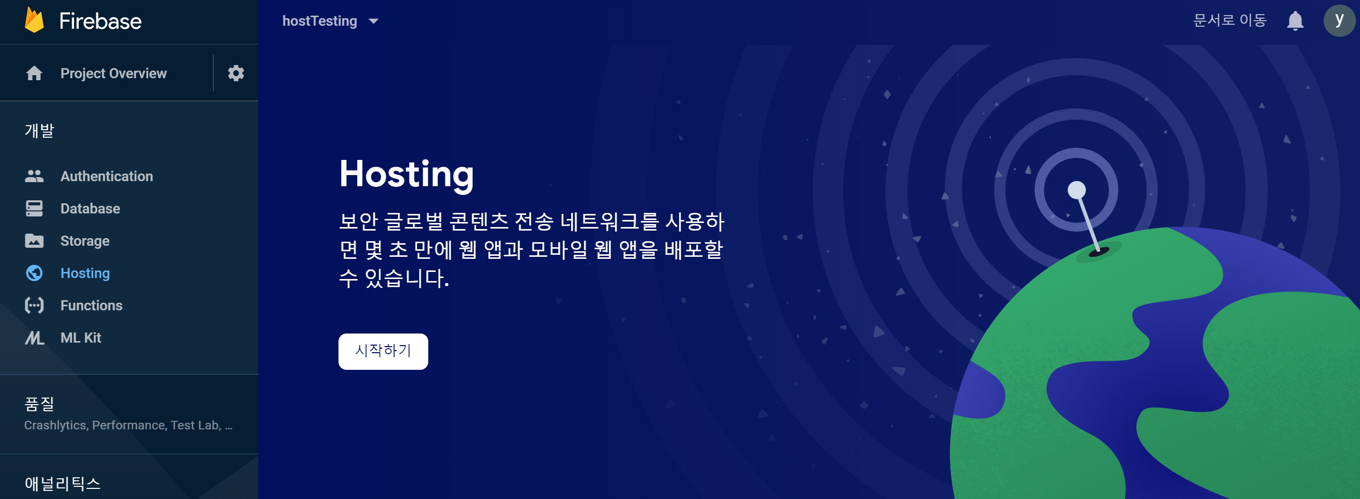 왼쪽 개발 탭의 메뉴 중 Hosting을 클릭합니다.