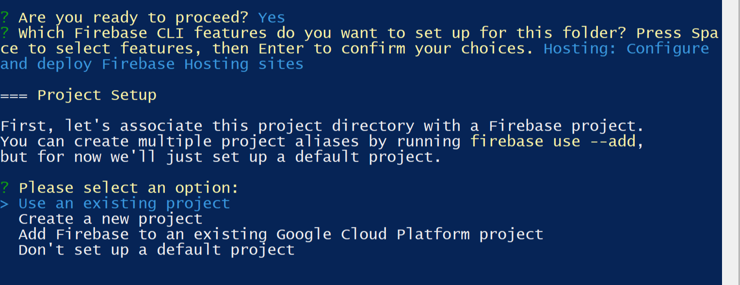 호스팅에 사용할 프로젝트를 이미 만들었으니 Use an existing project에 커서를 두고 엔터