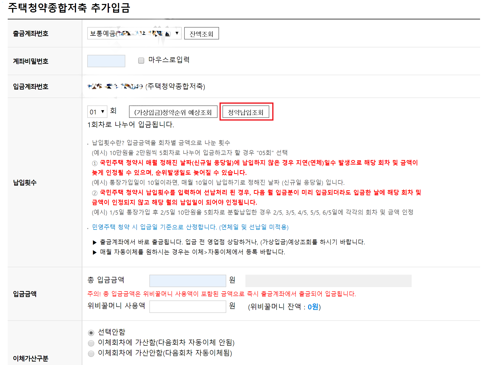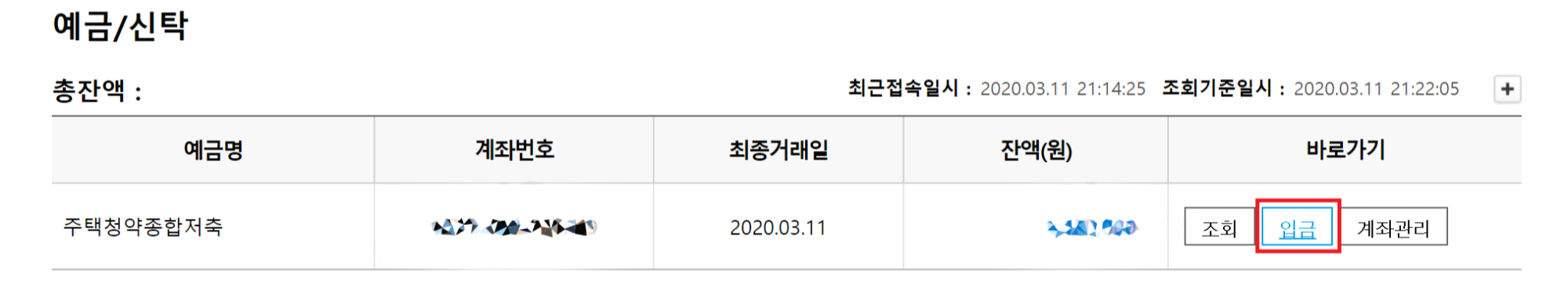 2. 주택청약종합저축에서 입금 메뉴로 이동