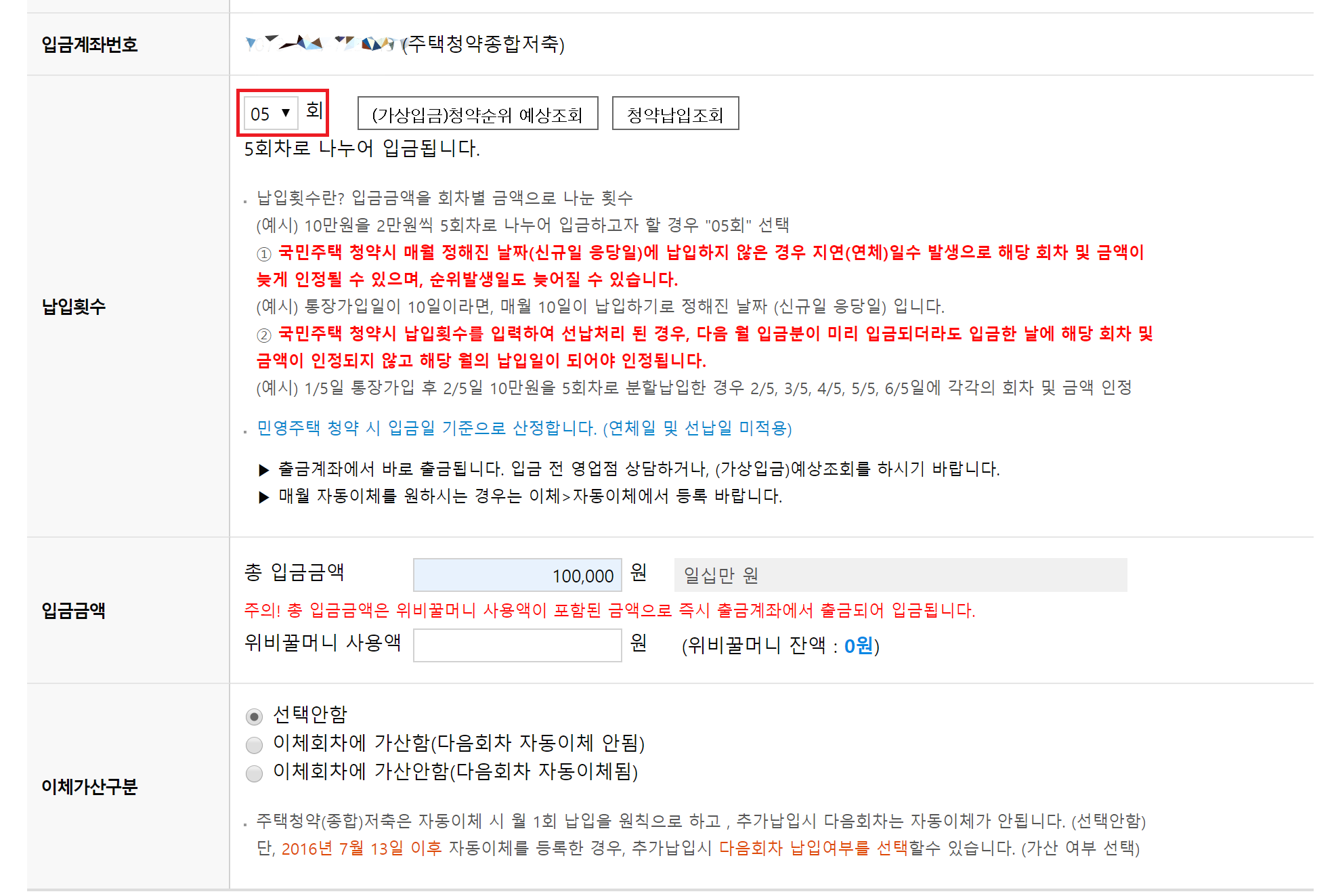 그런데 주택청약 납입에 지연횟수가 있으면, 한번에 입금함으로써 지연횟수를 줄일 수 있습니다.