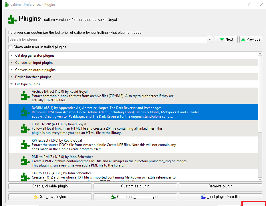 그리고 아까와 같은 Plugin 창에서 아래와 같이 deDRM이 설치되었음을 확인할 수 있습니다.