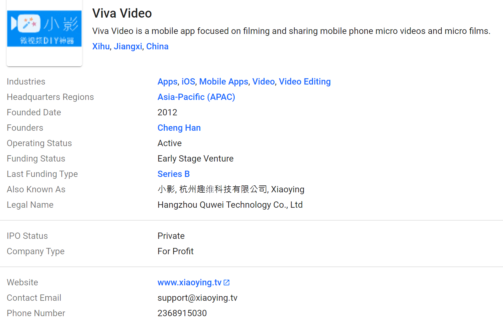 비즈니스 정보 검색 사이트인 Crunchbase에서 Viva video에 대한 다음과 같은 내용을 확인했습니다.