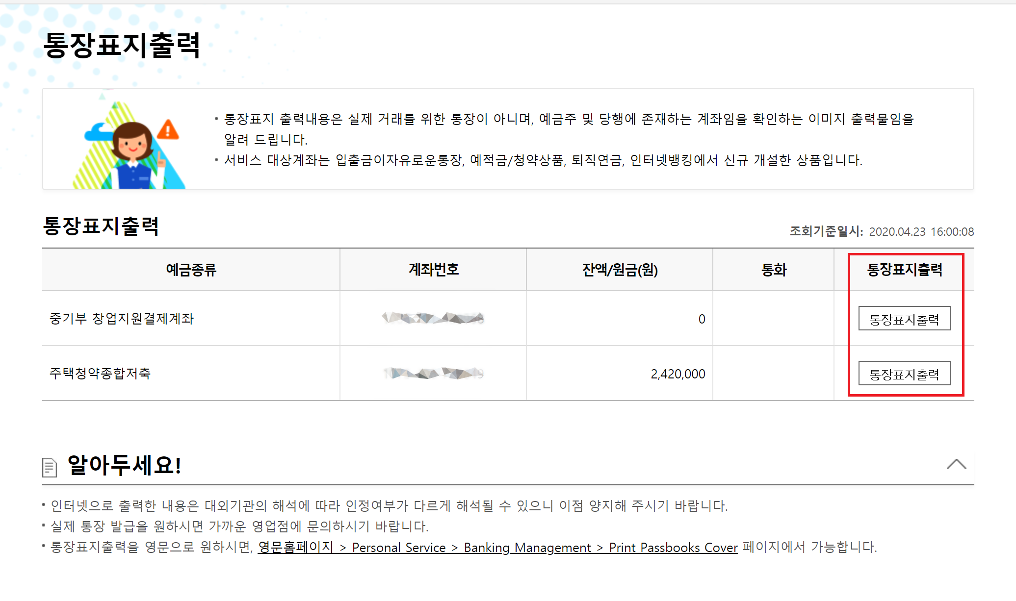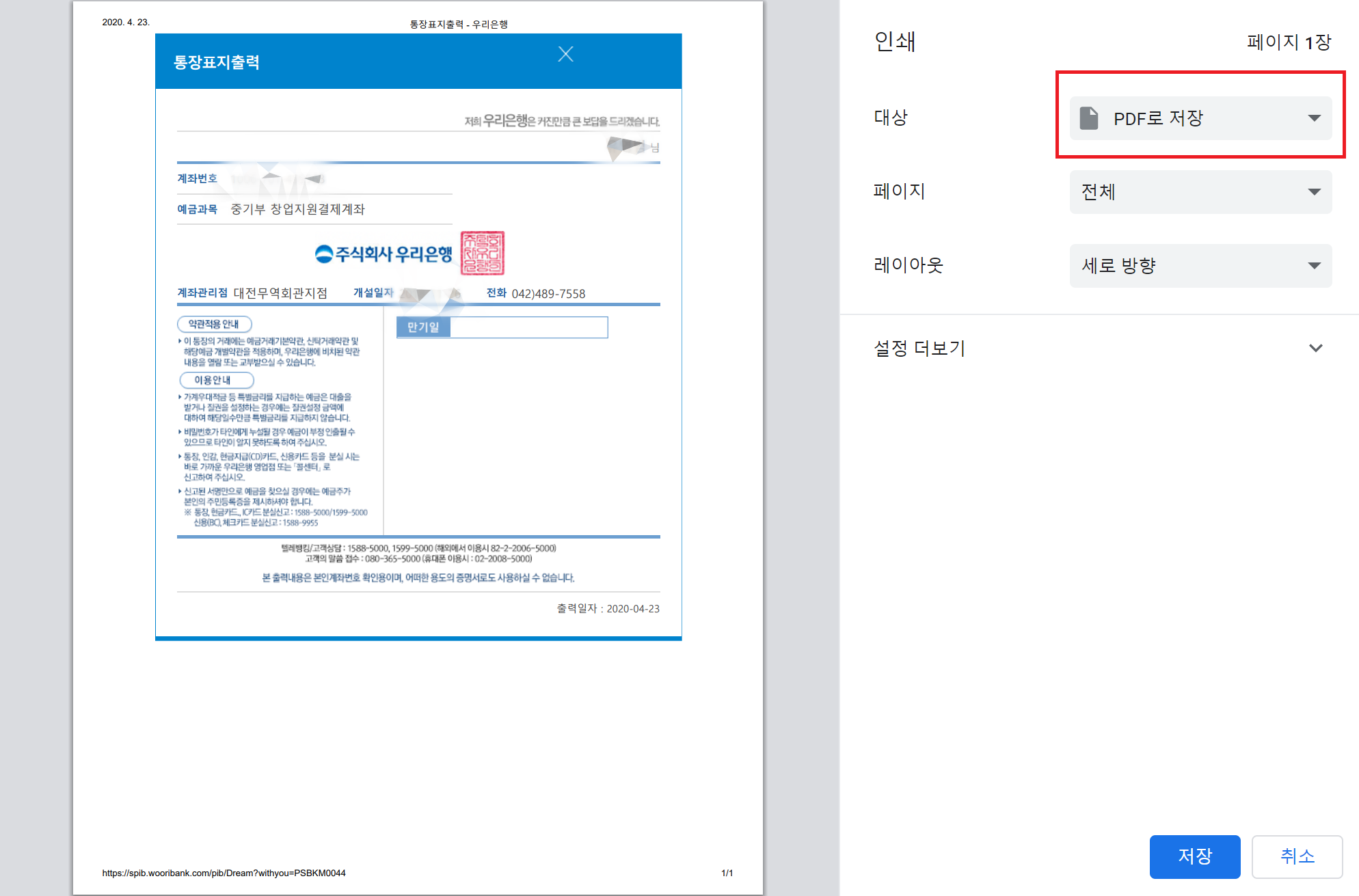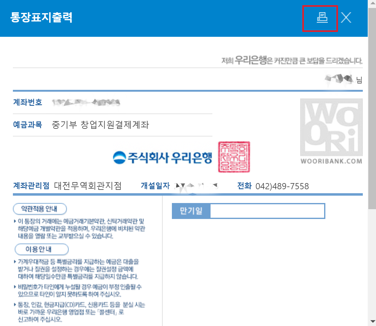 '통장표지출력'을 실행하면 갖고 있는 계좌들의 통장표지(통장사본)를 출력할 수 있습니다.