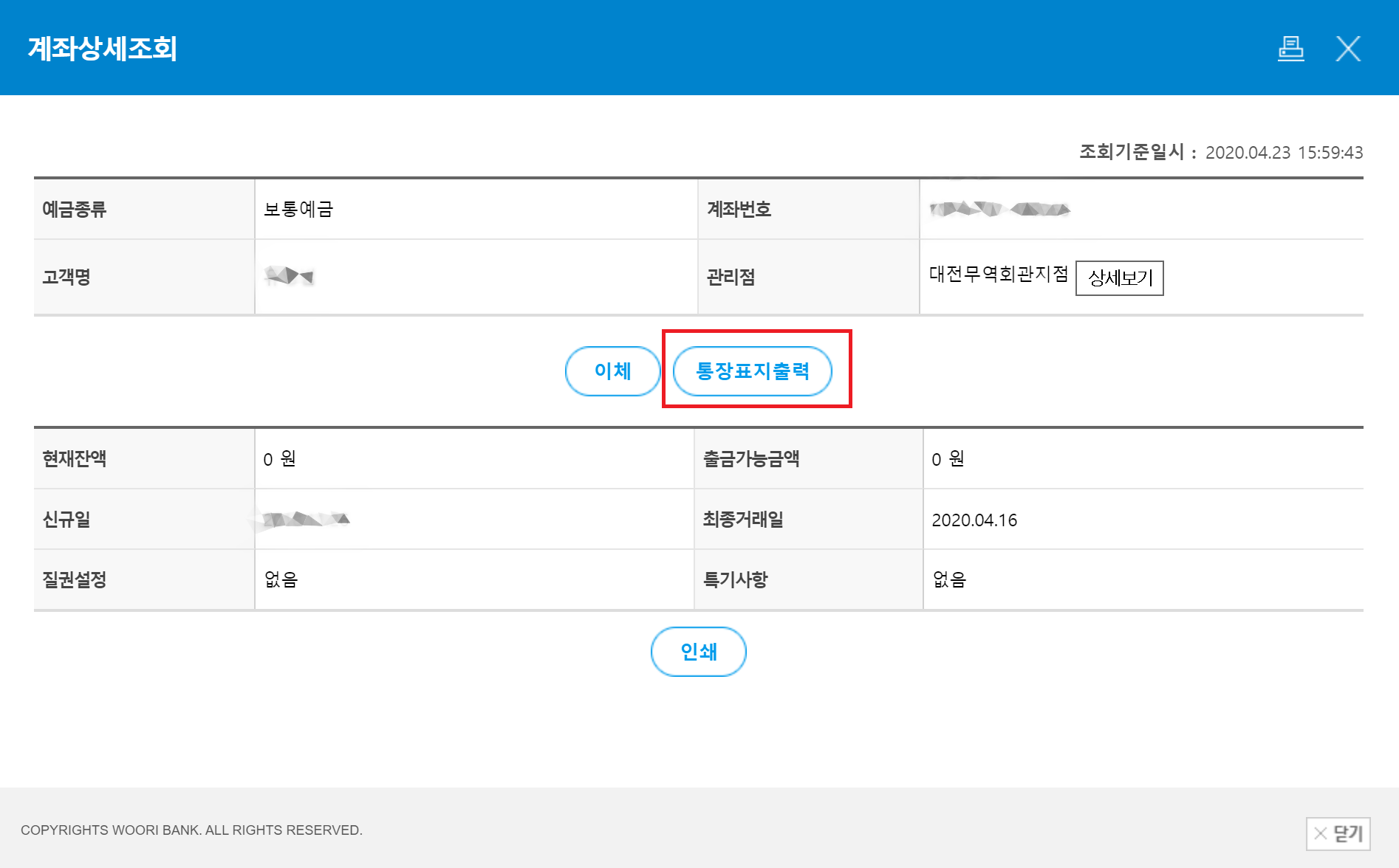 '계좌상세조회' 메뉴에서 다음과 같이 '통장표지출력'을 실행할 수 있습니다.