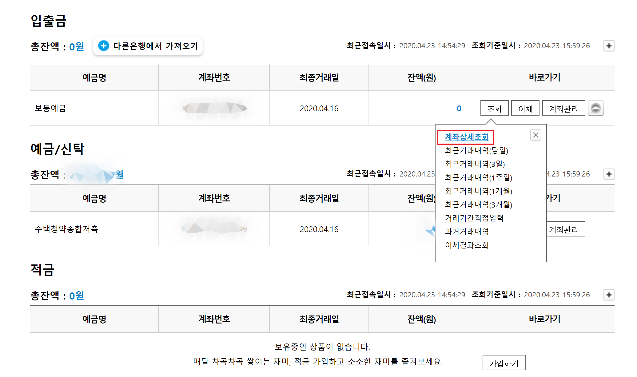 아무 계좌에서 '계좌상세조회'를 클릭합니다.