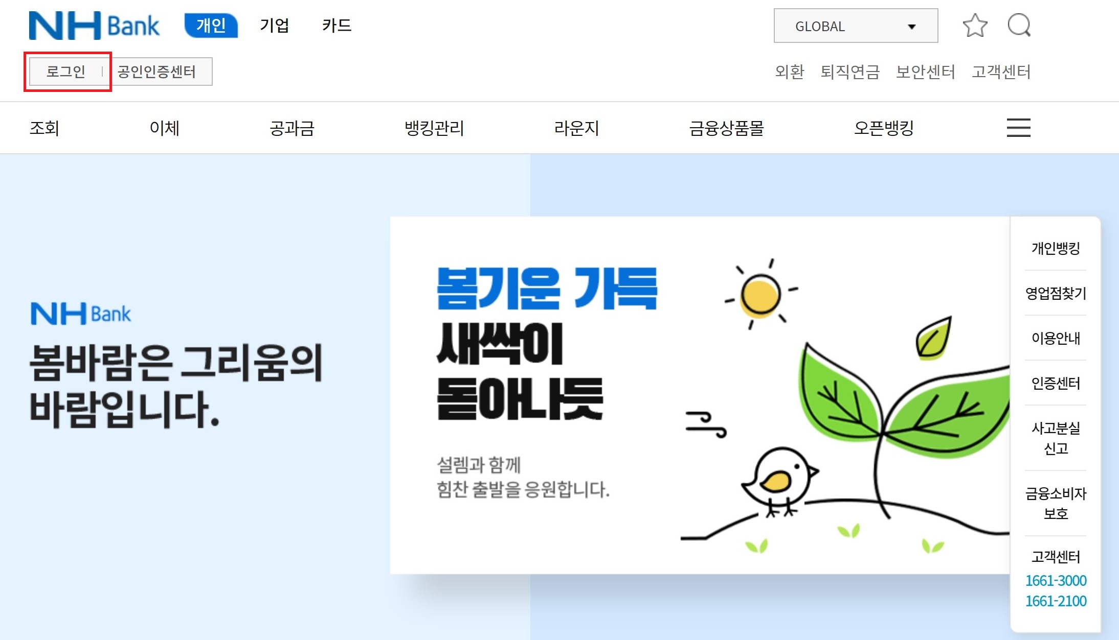 항상 NH농협을 이용해 주시는 고객님께 진심으로 감사드립니다. 고객님의 안전을 위해 간단한 금융거래는 스마트뱅킹을 이용해 주시고 영업점 등 공공장소방문 시에는 마스크 착용 등 예방수칙을준수해 주시기 바랍니다. ▷ 영업시간 단축 영업점 안내 ▷ 고객행복센터 교대근무로 인한 연결지연 안내 ▷ 코로나19 피해 소기업/소상공인 대출상품 안내 ▷ 비대면으로 처리 가능한 업무 안내 ▷ 코로나19 관련 보이스피싱 단계별 예방 원칙 안내 ※ 마스크 공급일정은 농협 하나