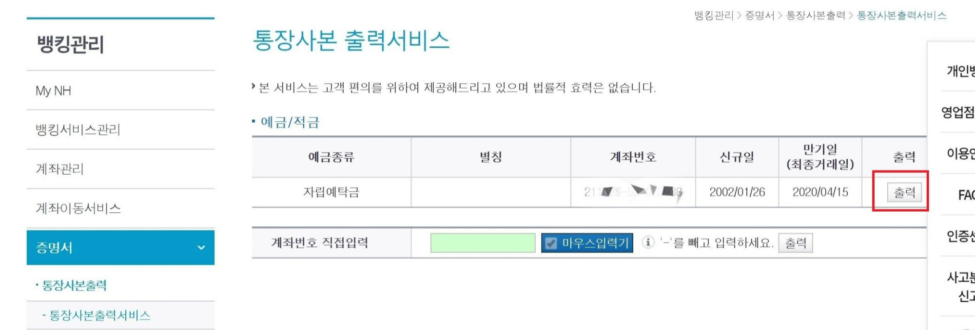 이제 통장사본을 출력하거나 PDF로 저장하고자 하는 계좌 옆의 '출력' 버튼을 클릭합니다.