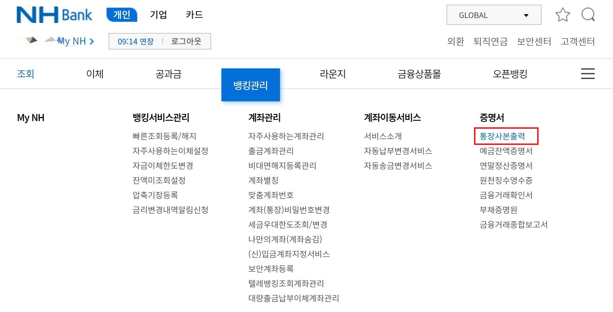 다수의 서류 발급 기능은 이곳 '뱅킹관리'에서 실행합니다.