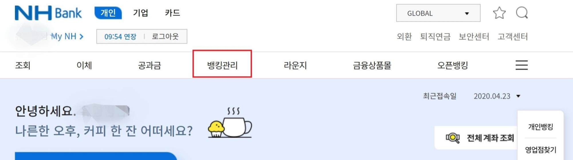 그렇지만, 통장사본을 출력하기 위해서는 계좌 조회가 아니라 상단 메뉴 중 '뱅킹관리'로 들어갑니다.
