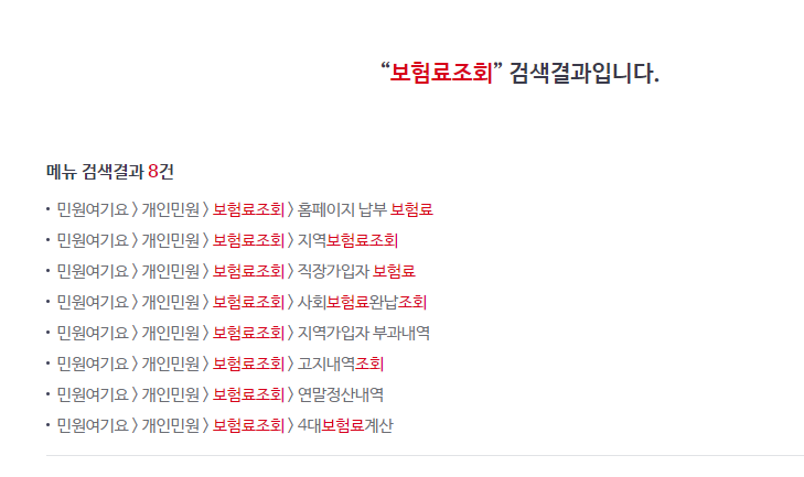 아래는 보험료조회로 검색했을 때 노출되는 메뉴 목록입니다.