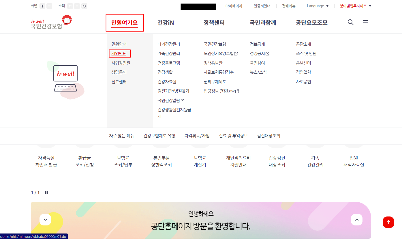 국민건강보험공단 홈페이지에서 로그인 후 상단 메뉴 중 민원여기요 -> 개인민원 선택합니다.