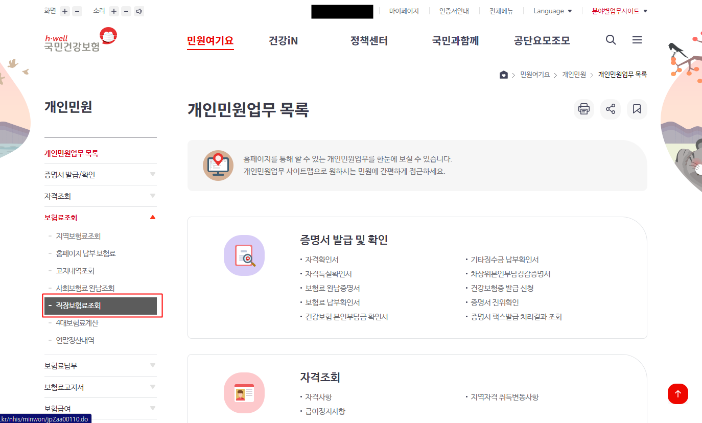 개인민원 페이지에서 진입하면, 좌측 메뉴에서 보험료조회 -> 직장보험료조회 항목 선택합니다.