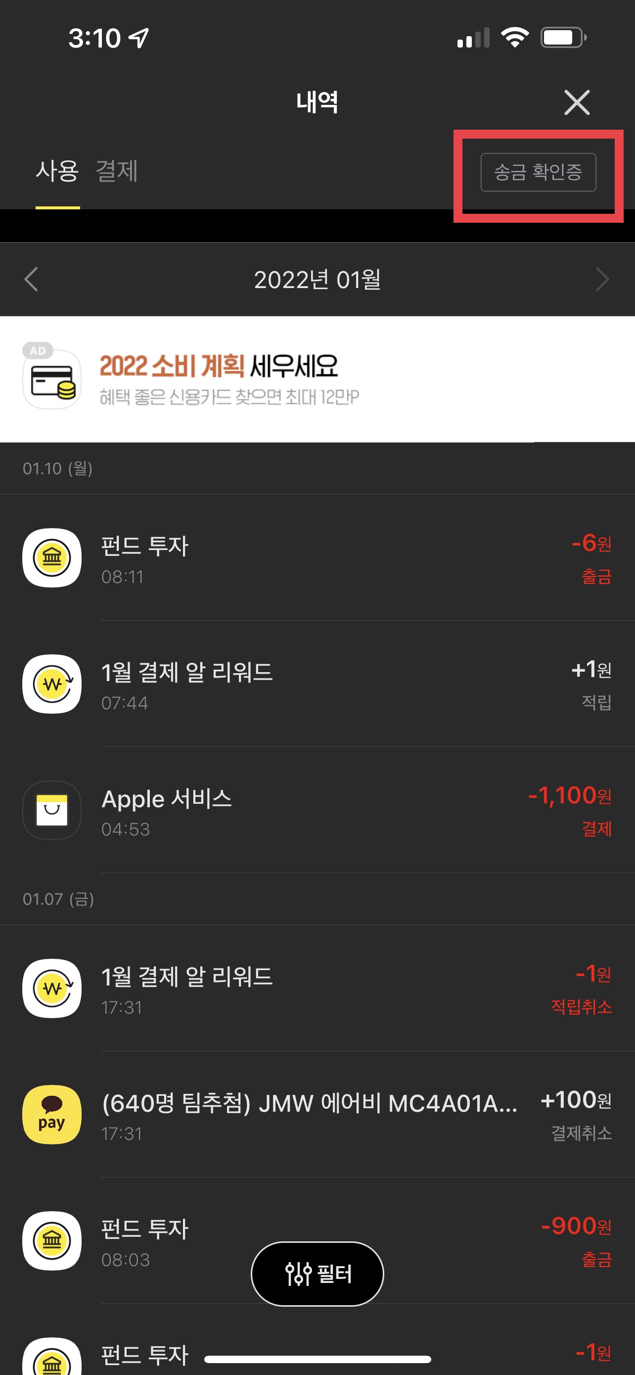 카카오톡, 카카오페이에서 이체한 내역이 나타납니다.