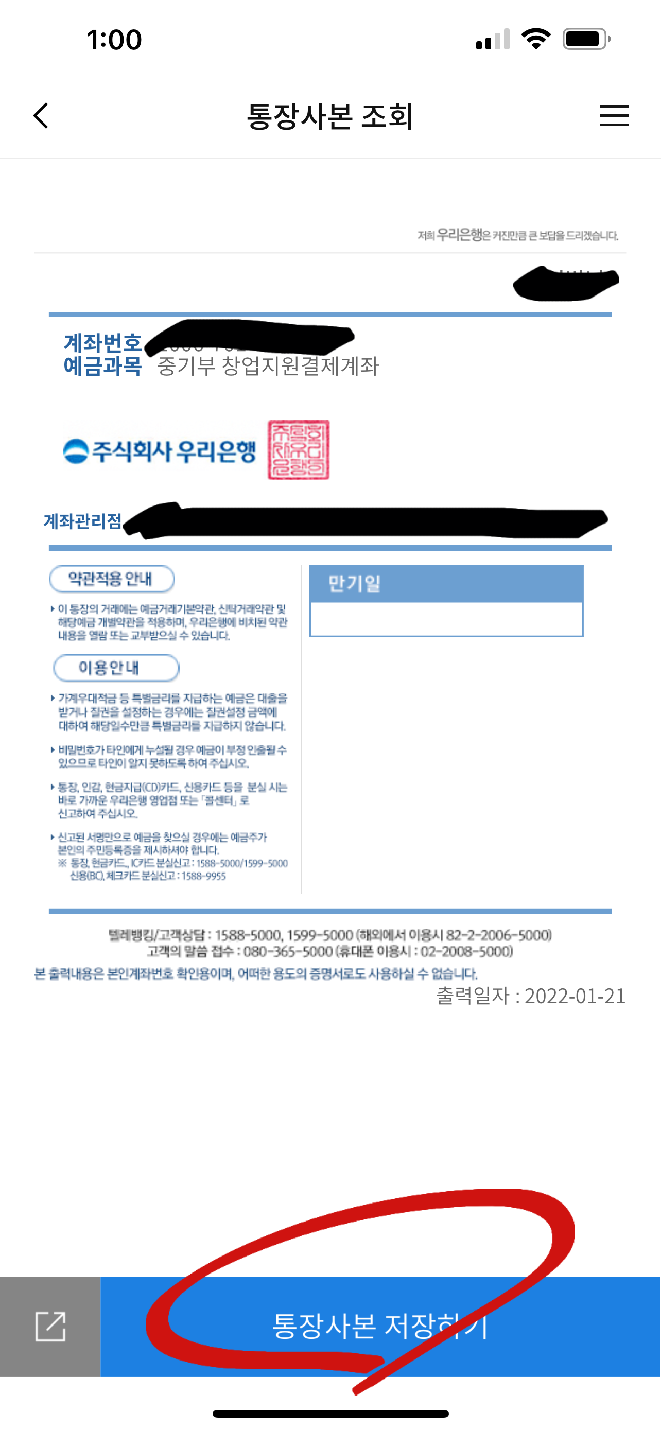 하단의 통장사본 저장하기 버튼을 선택하면 통장사본이 이미지로 저장됩니다.