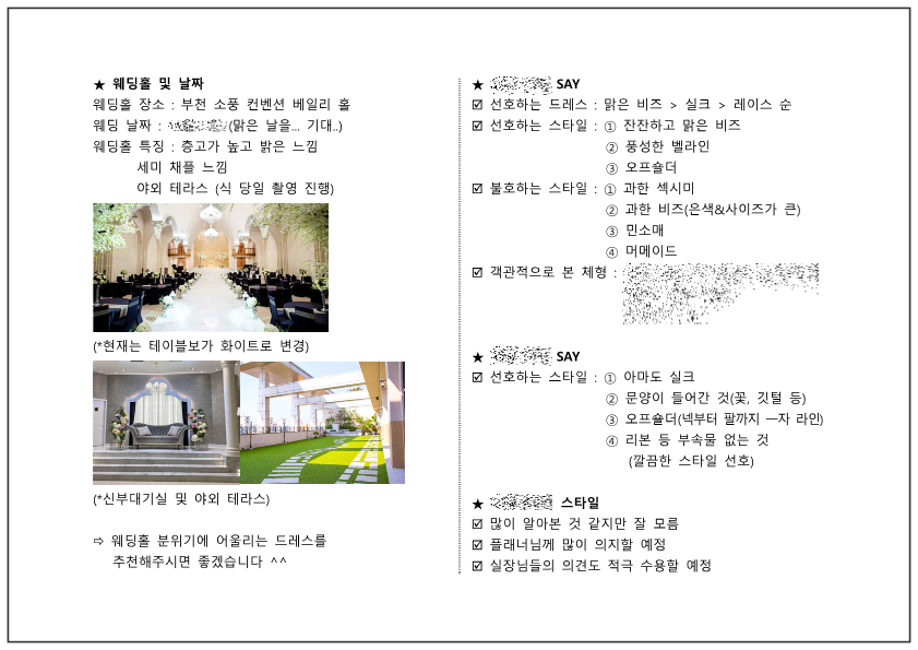 저희는 여자친구가 아래와 같이 취향 외에도 식장 분위기에 대한 정보, 본인 체형에 대한 본인의 생각을 정리해서