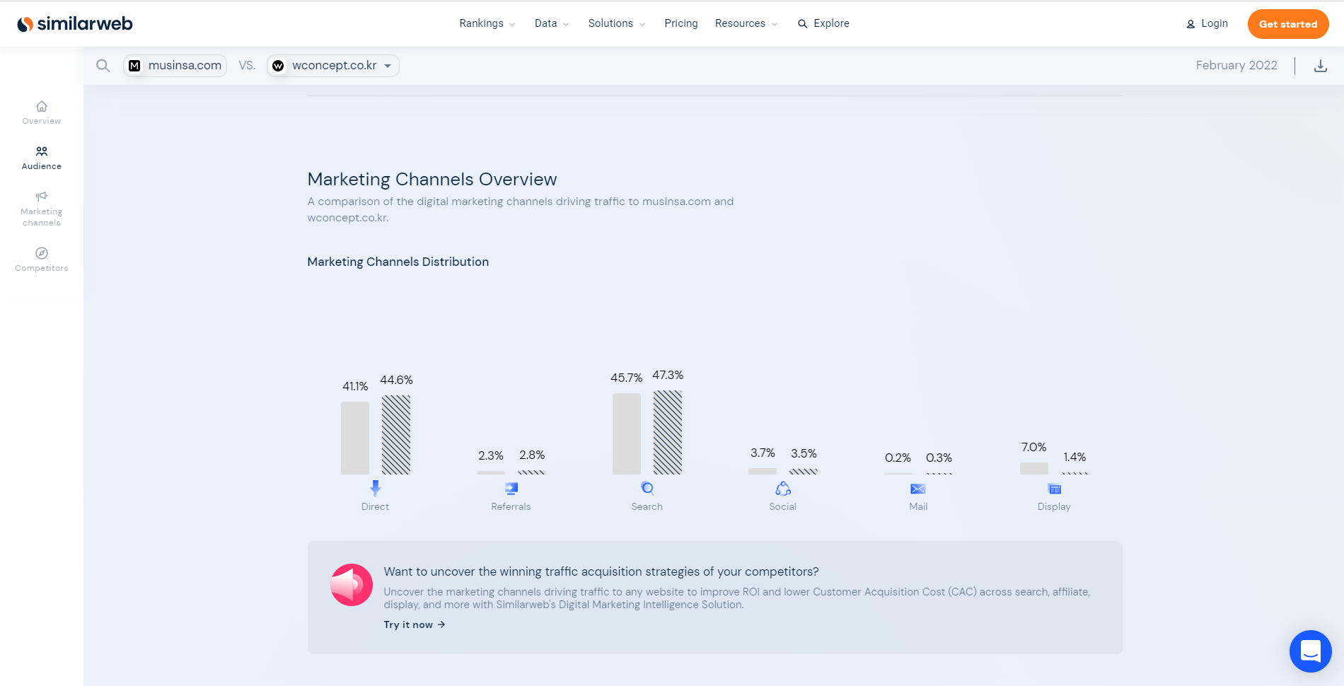 - 비교 사이트를 선택하면, 두 사이트 간의 트래픽과 유입에 대한 비교분석 제공
