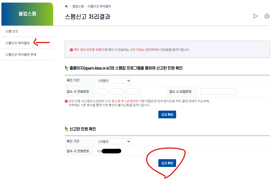 또한 자신이 신고한 불법 광고/스팸에 대한 처리 결과를 확인할 수 있습니다.
