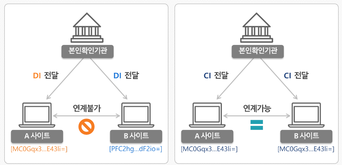 이는, CI가 각 주민등록번호에 고유한 범용 값인 것에 반해서, DI는 이용하는 서비스마다 달라지기 때문입니다.