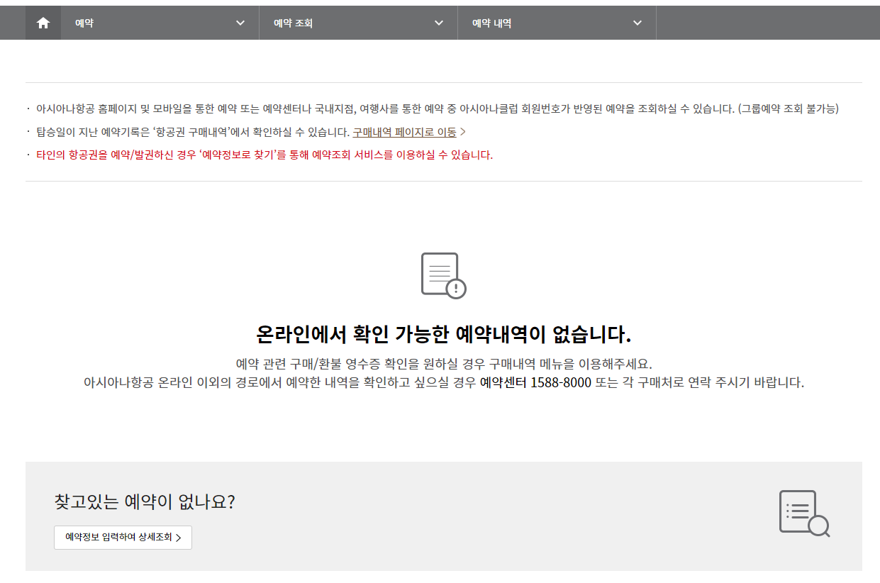 그런데 여행 준비 과정에서, 아시아나 항공 홈페이지에서는 예약 내역이 조회되지 않고,