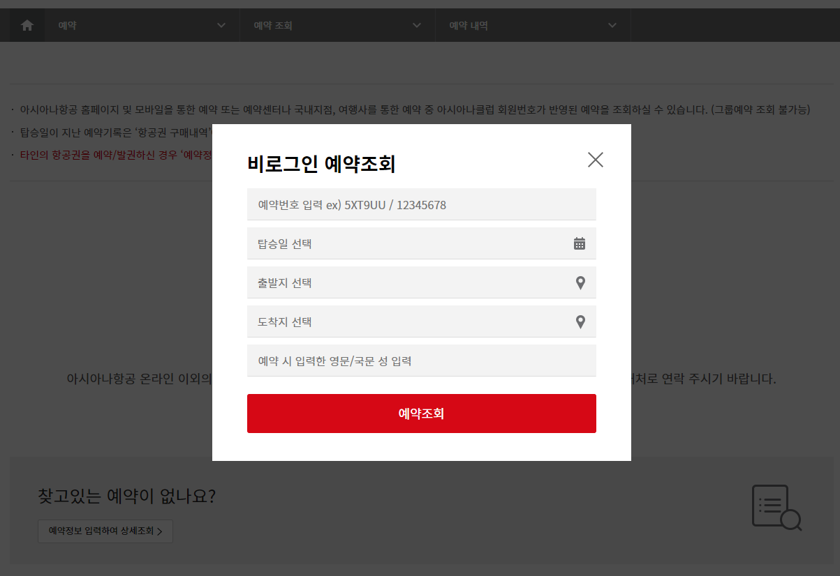 여행사 등 외부 채널을 통해서 예약한 항공편은 홈페이지 예약 내역에서 조회되지 않을 수 있습니다.