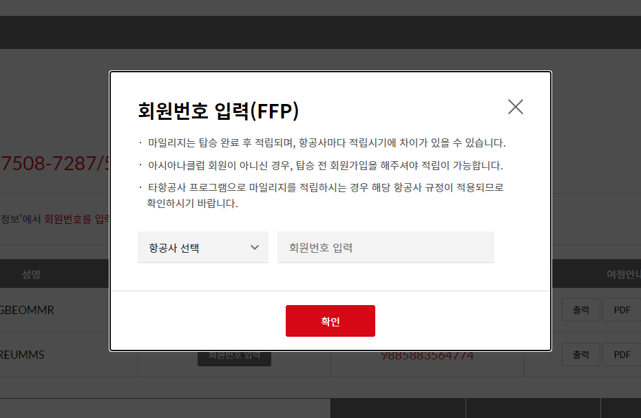 [외부 예약 항공편 아시아나 마일리지 적립/좌석 업그레이드 방법]