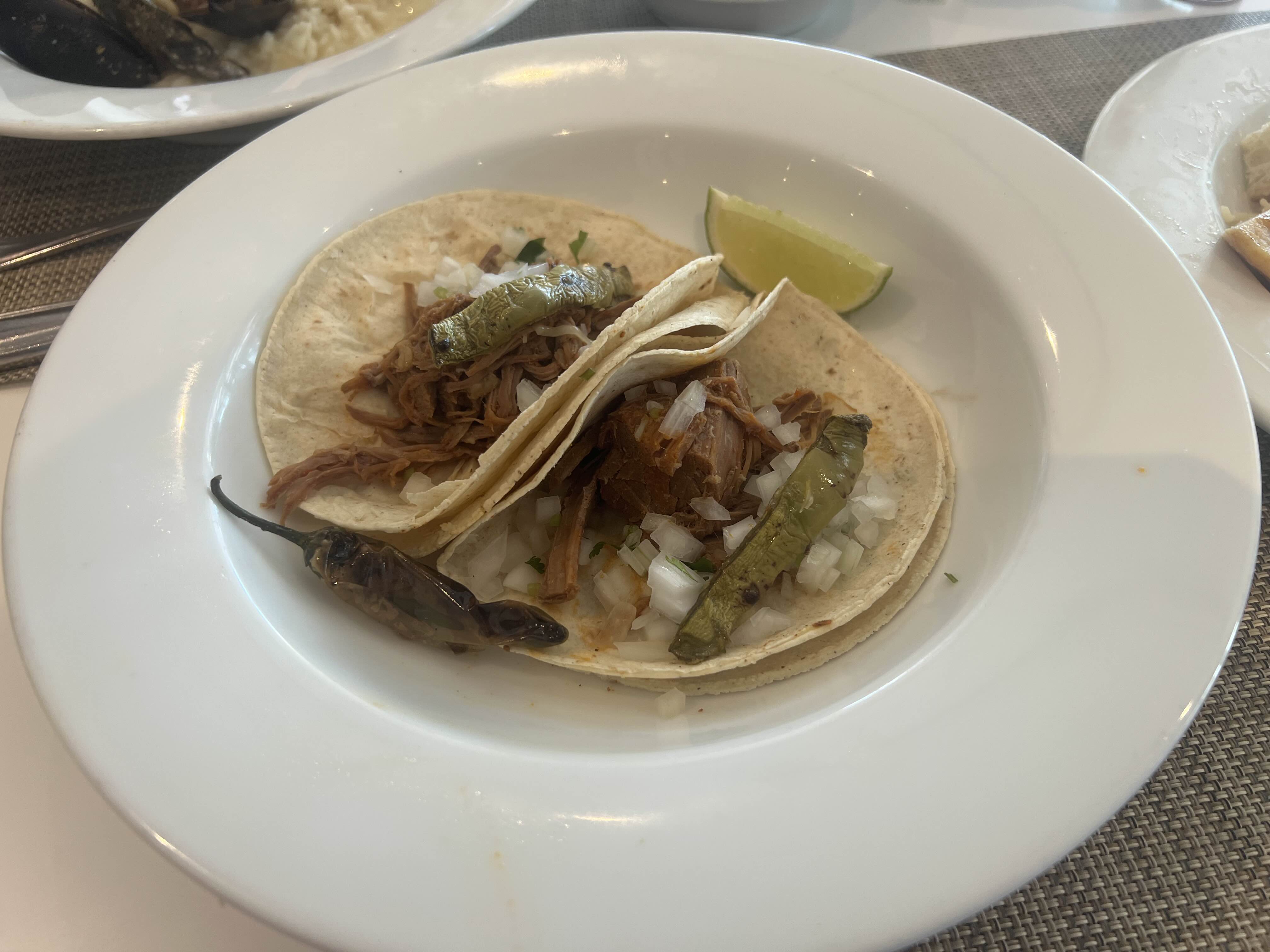오른쪽 페이지에 타코, 메인코스가 나열되어 있습니다.