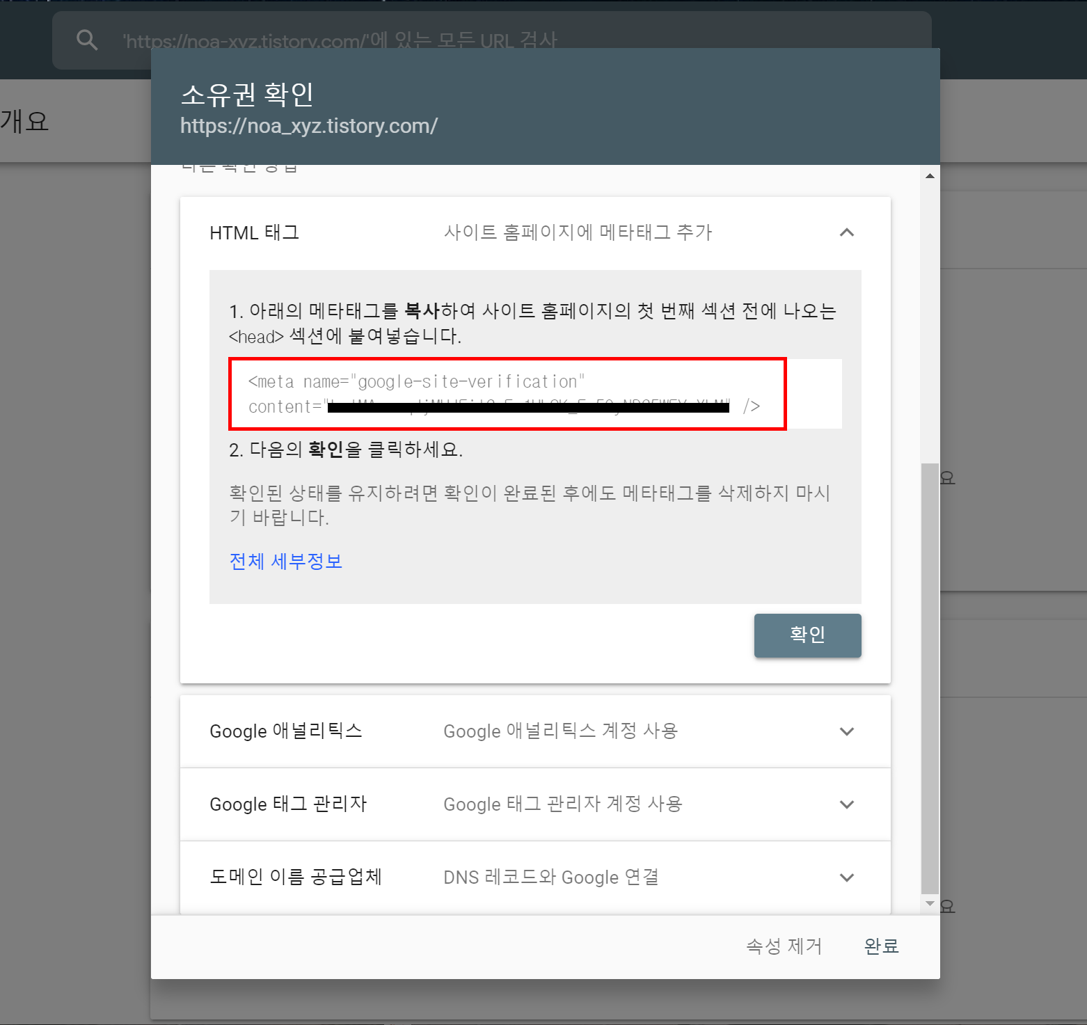 그로써 구글 서치콘솔에서 만들고자 한 속성에 연결된 도메인(티스토리 블로그)이 본인 소유임을 확인하는 것입니다.