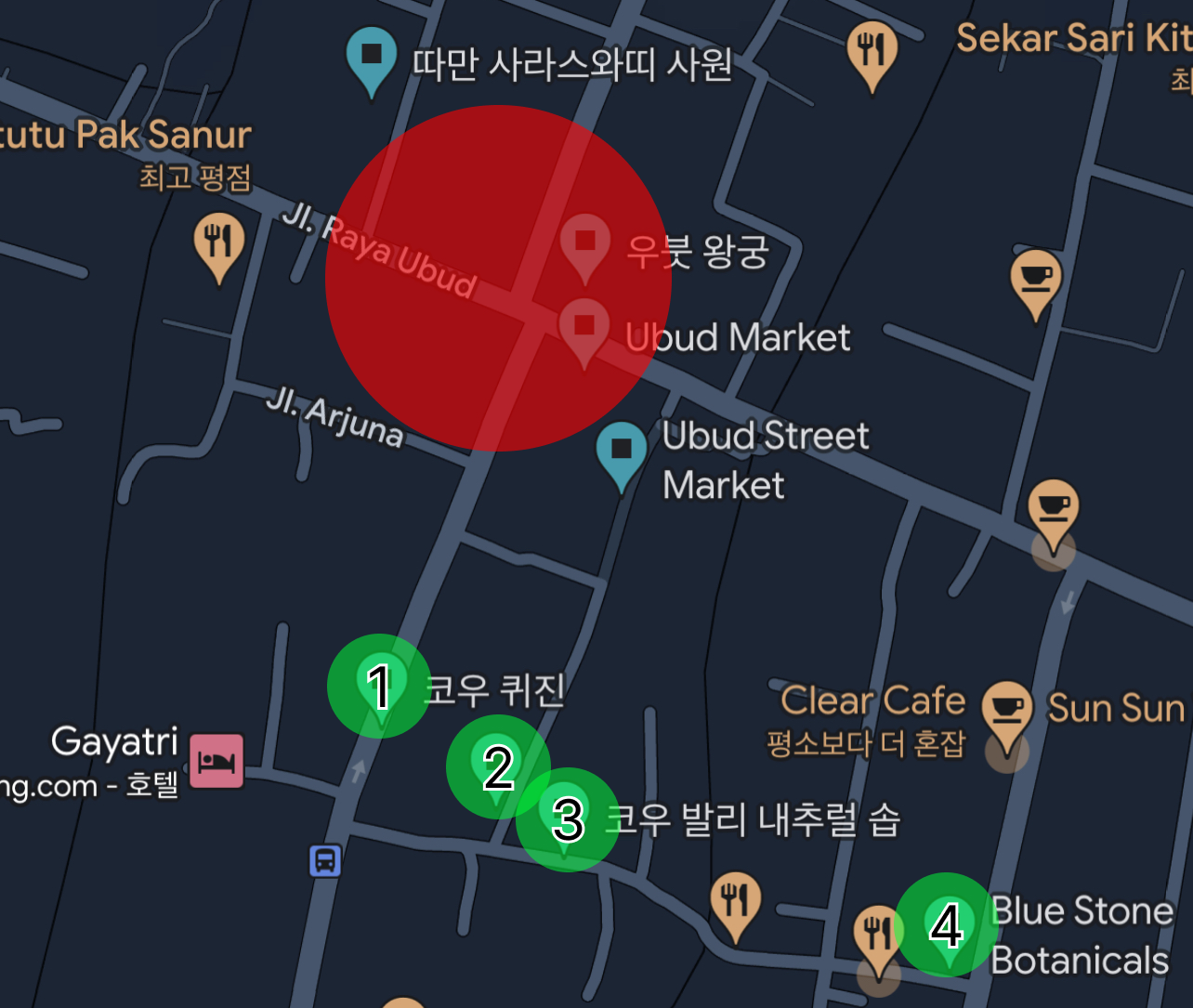 지도에 표시된 것처럼 우붓 시장도 근처에 있어서 항상 번잡한 곳이었습니다.