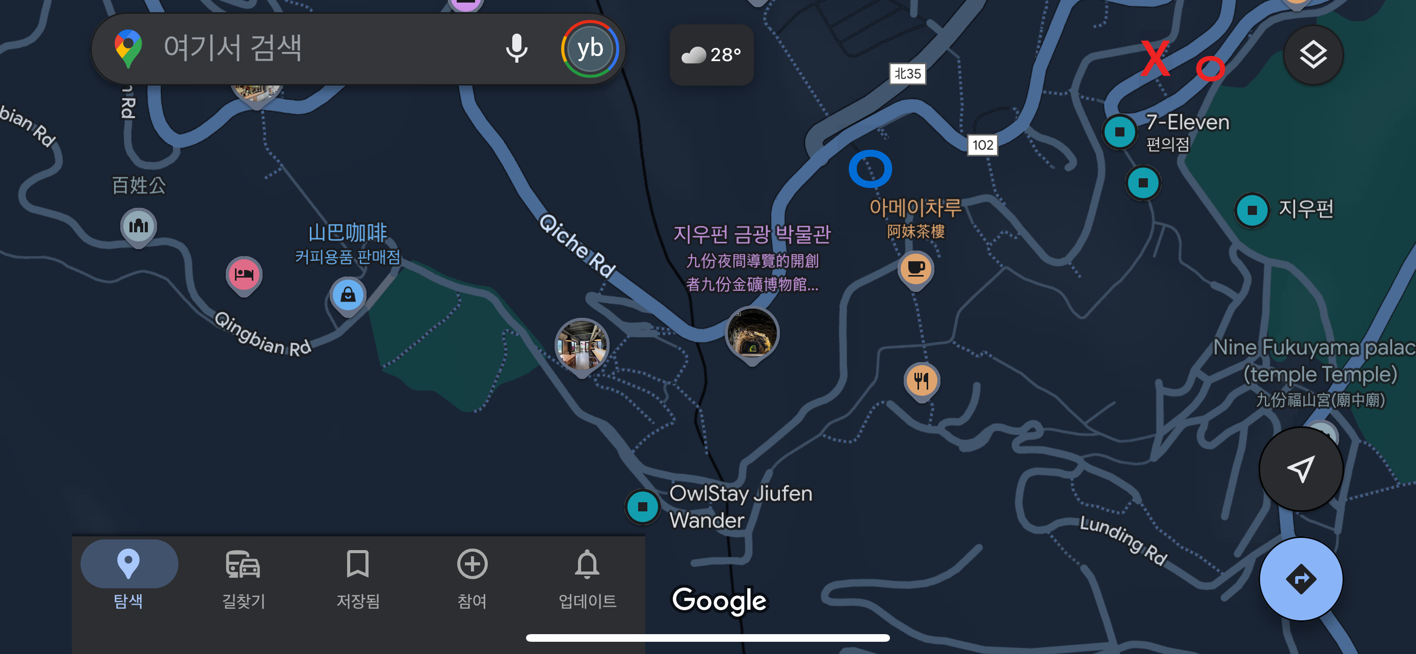 - 가운데 파란 O : 점선으로 이어진 길이 '지우펀'하면 떠오르는 계단 골목