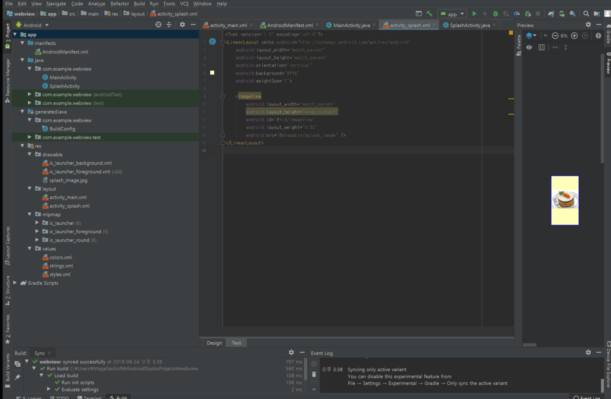 이미지를 그곳에 위치시킨 뒤, 위에서 불러오기로 한 이름 splash_image로 이름을 바꿔줍니다.