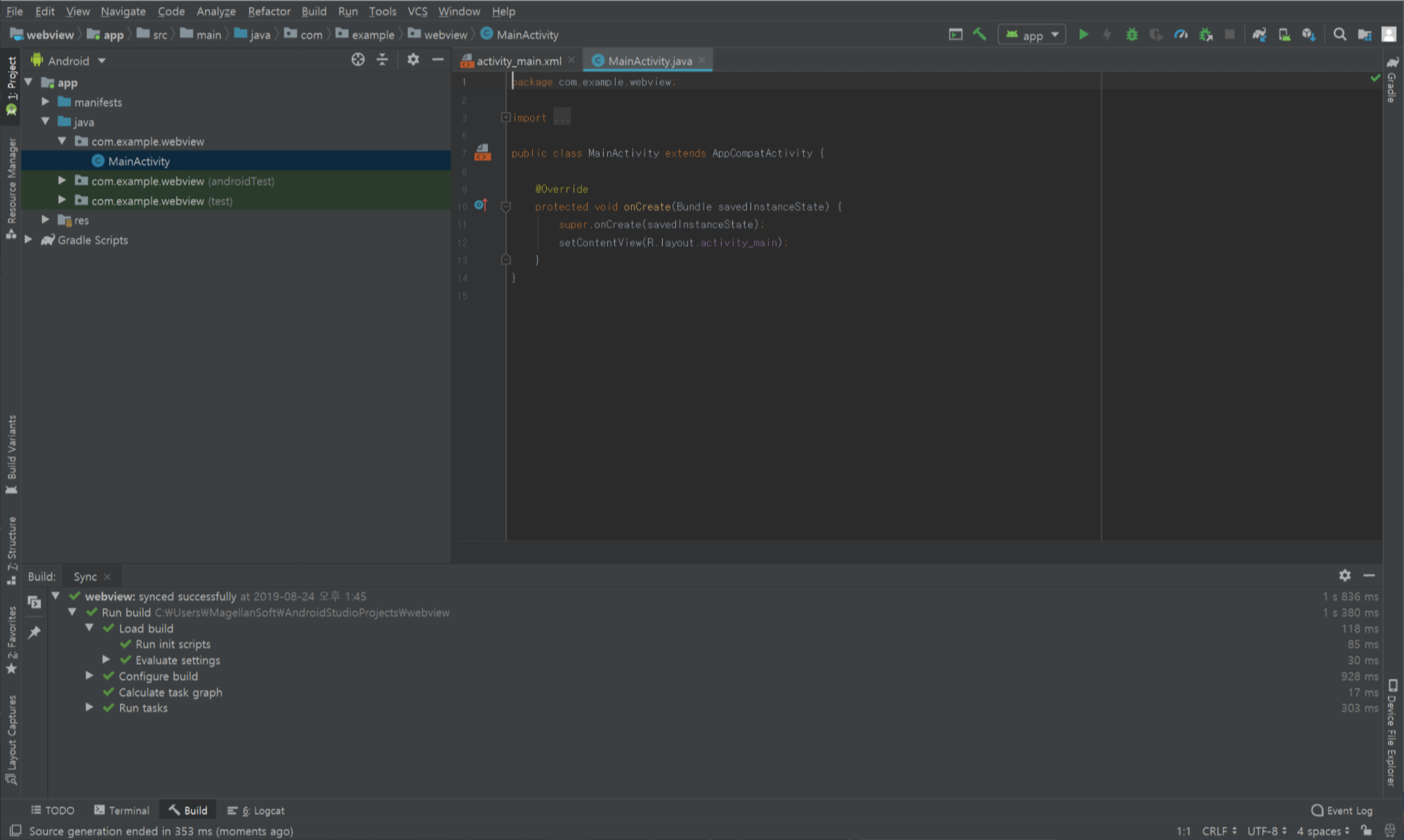 activity_main.xml 그리고 MainAcvitivy.java 두 개 창이 열려있습니다.