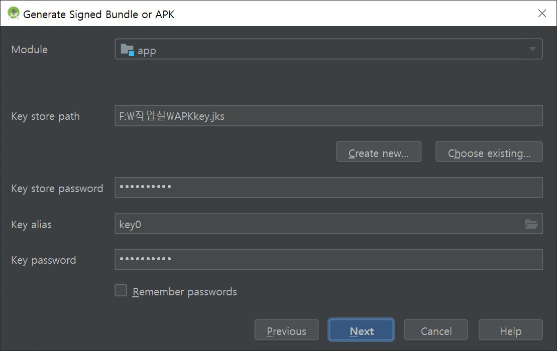 키가 없다면, 잘 보관할 수 있는 곳에 키를 생성하고 스토어 비밀번호, alias, 키 비밀번호를 설정합니다.