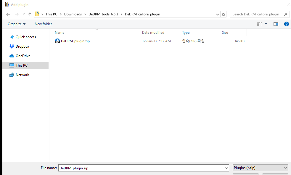 여기서는 그 안의 DeDRM_plugin.zip 파일을 압축된 상태로 선택합니다.