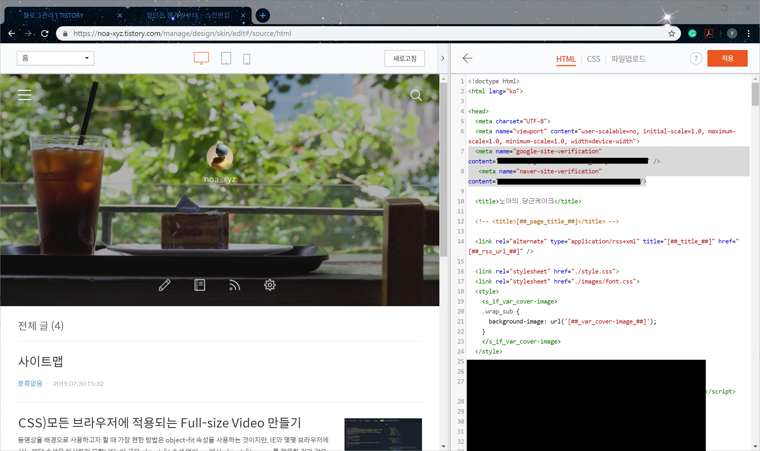 앞에서 복사한 메타 태그를 티스토리 블로그에 입력해야 합니다.